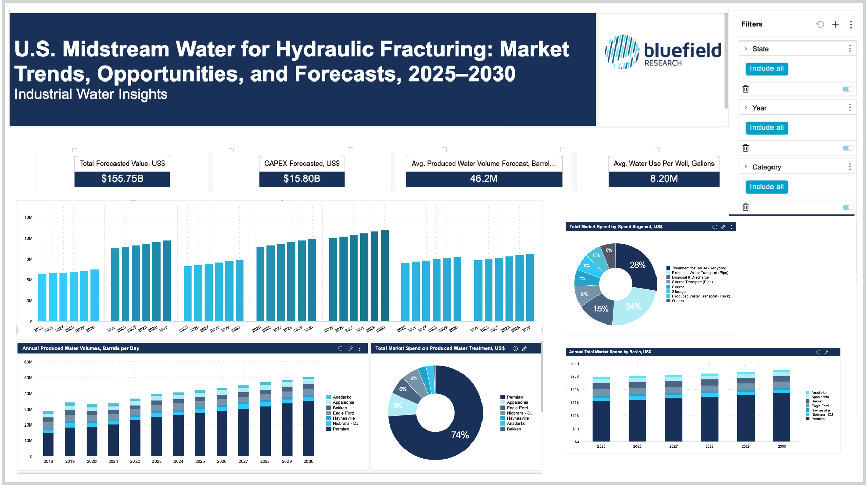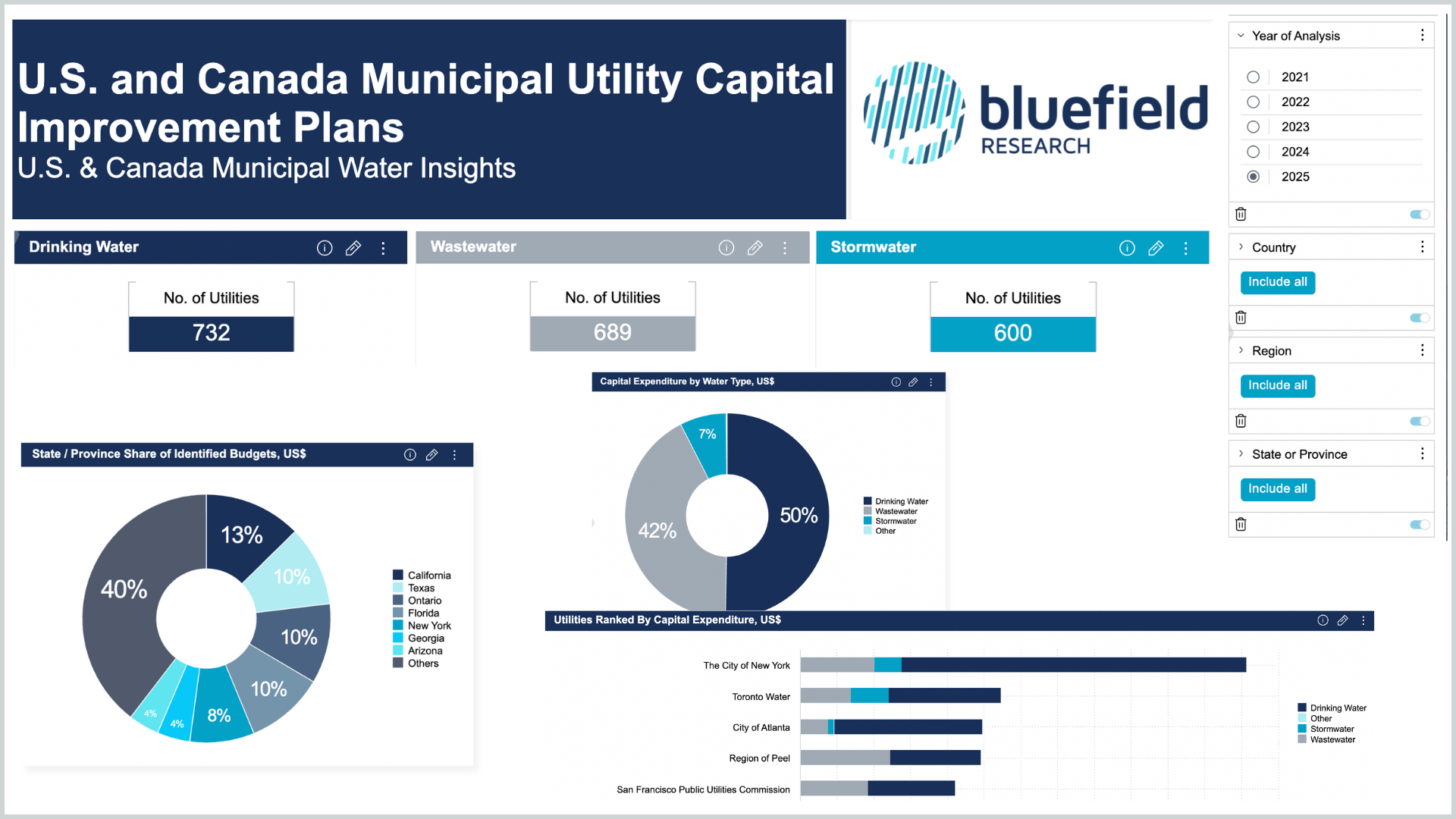 Customizable data dashboards allow clients to filter water market data by region, segment, geography and company type.