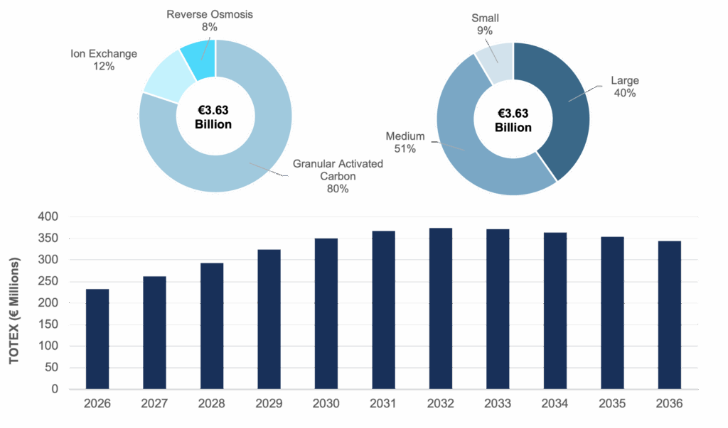 This evolution is expected to unlock a second wave of investment focused on higher-selectivity technologies. Driven by long-term performance management needs, utilities will increasingly adopt selective resins, hybrid treatment trains, and destruction pathways designed to reduce residuals and long-term exposure. In this context, ion exchange and reverse osmosis are projected to represent 12% and 8% of total forecast expenditures, respectively.