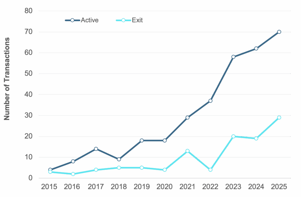 - Acquisitions far outpace exits, with just 87 exits recorded since 2015. The majority have occurred through strategic sales (55%) and secondary buyouts (35%). Initial Public Offerings (IPOs) remain rare, with only six public listings during this period.