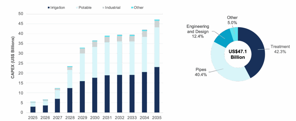 While demonstrated at scale in other countries, the increasingly widespread deployment of potable reuse systems makes the U.S. market unique. By 2035, potable reuse projects are expected to account for 37.0% of all new reuse capacity additions, signaling a strategic shift toward higher-value, supply-resilient applications for some communities. Associated capital expenditures are forecasted to surpass US$19.9 billion.